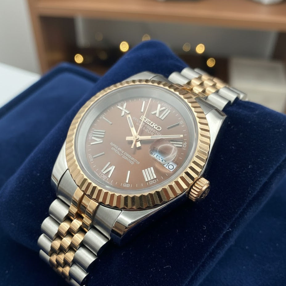 Personnalisation exclusive réalisée pour un client, cette Seiko Mod Datejust associe un boîtier bicolore argent et or à un cadran marron avec chiffres romains.