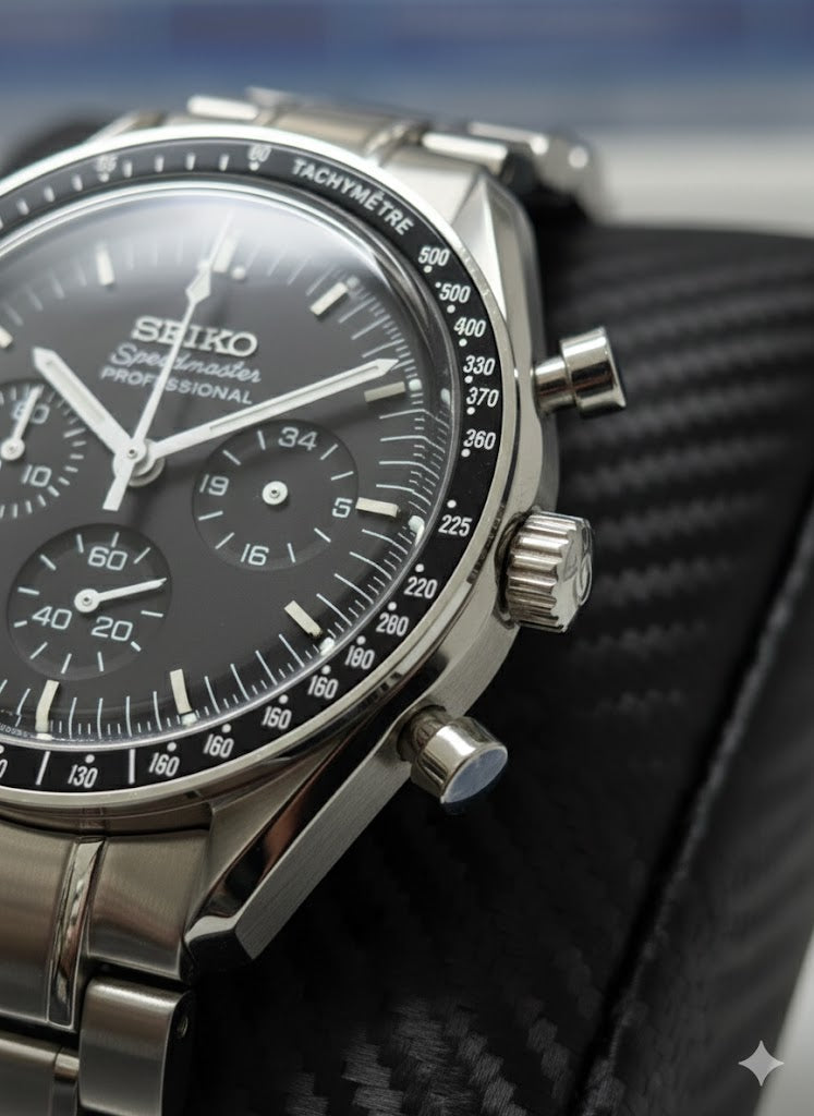 La Seiko Mod Speedmaster s’inspire des chronographes iconiques, avec un boîtier aux lignes équilibrées et une identité résolument sportive.